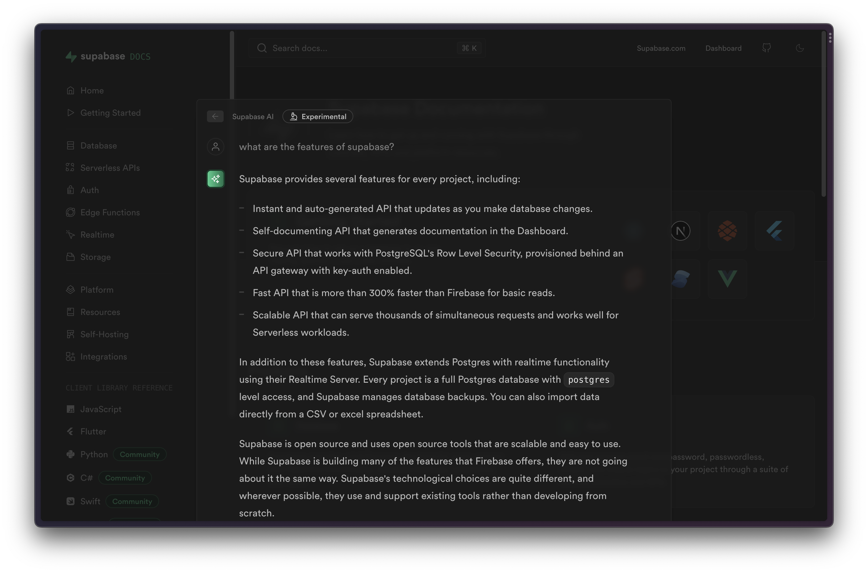You can see how this works with the Supabase docs. Just hit cmd+k and "ask" for something like "what are the features of Supabase?". You will see that the response is streamed back, using the information provided in the docs: