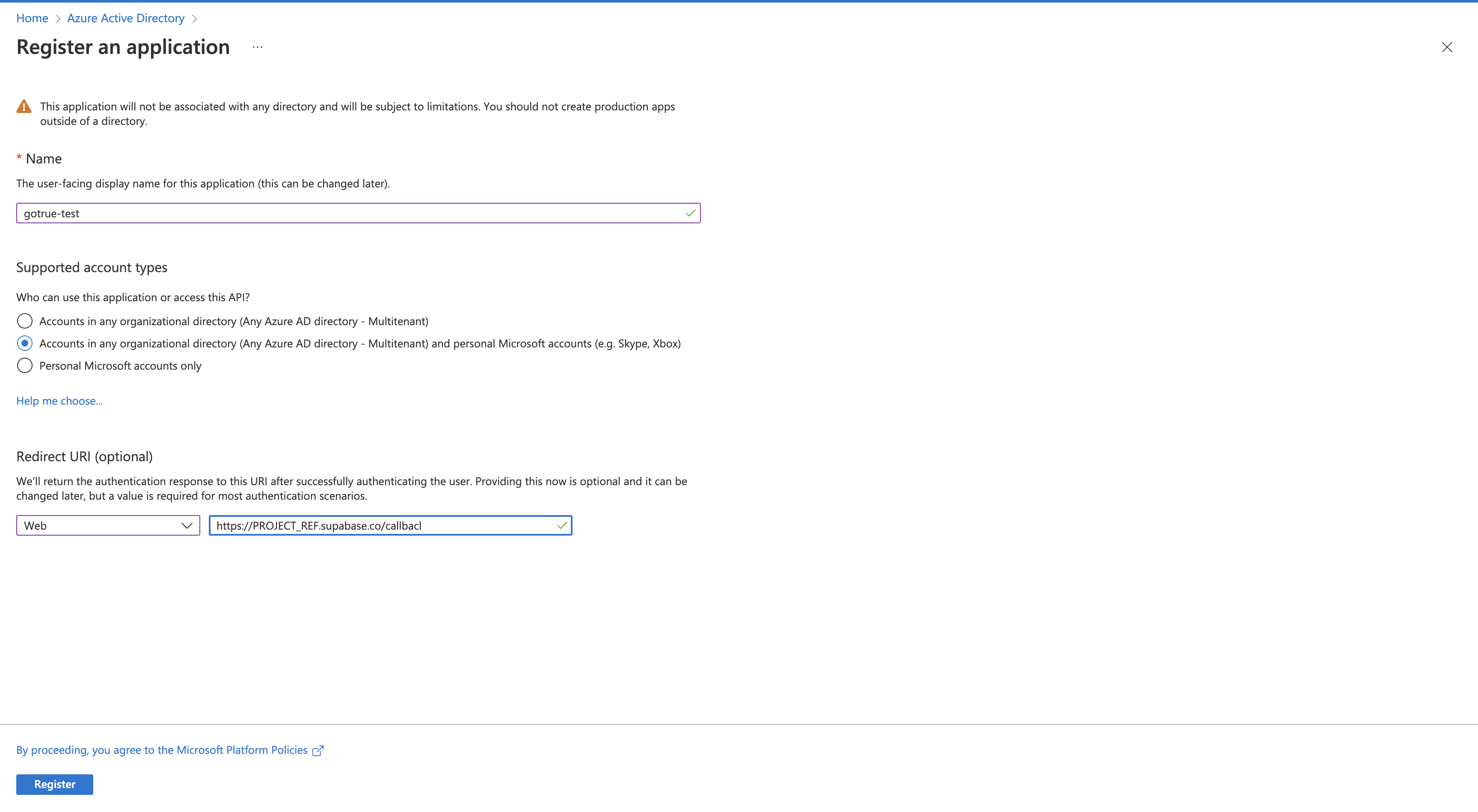 • Specify a Web Redirect URI. It should look like this: https://<project-ref>.supabase.co/auth/v1/callback